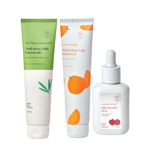 BBB Better Body Bombay Tea Tree Face wash & Blood Orange Moisturizer & Onion Seed Extract Hair Growth Elixir Pack of 3